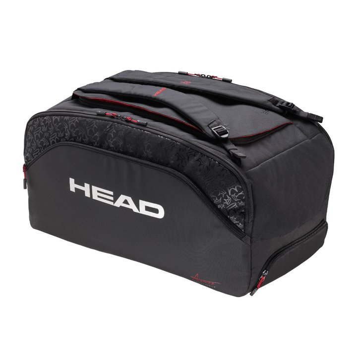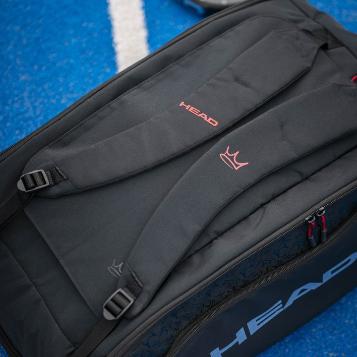 Exclusive, elegant style – including some personal touches – from ‘King Coello’. Part of the Arturo Coello collection, the COELLO PRO X PADEL DUFFLE BAG L was designed and developed in collaboration with the world number one. Created from fabrics containing recycled PET bottles, this bag will appeal to the eco-conscious and the style-conscious; his crown logo on the side has a glossy finish and elevates the look. The silver HEAD logo adds style and contrast, standing out against the black, and the personal touches include the choice of red – one of Coello’s favorite colors – for the inside of the bag. Crown logos on the straps also enhance the distinctive, premium appeal of a bag that Coello’s fans will adore.