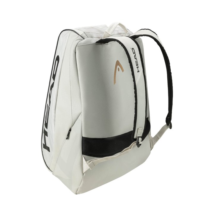 Refreshed with a luxurious, modern, off-white design, the PRO X PADEL BAG L YUBK offers style as well as space. There are two outside racquet compartments, one of which has CCT+ climate control technology to protect against extreme temperatures. In addition to a main compartment and a shoe compartment, the PRO X PADEL BAG L YUBK has two outside accessory zipper pockets and an inside accessory pocket. With the backpack carry system, you can carry your kit in comfort to your next match. As an illustration of how HEAD is trying to reduce plastic usage, the hangtag is made from recycled paper and tied with hemp cord.