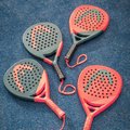 Hitting surface constructed with two layers of carbon fiber, for a stiffer and rigid surface providing extra control for medium-paced game situations.