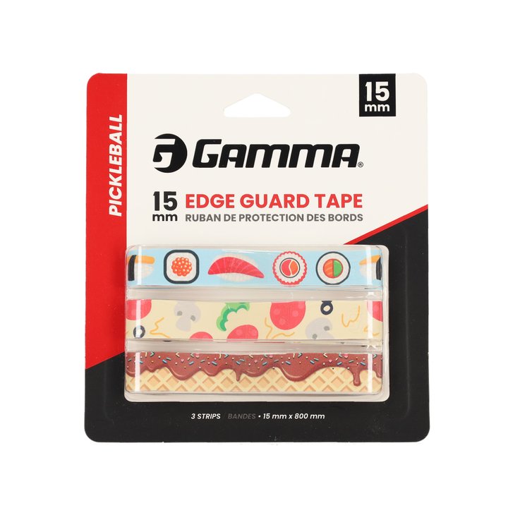 Now available in a 3-pack of food illustrations. GAMMA Pickleball Paddle Edge Guard Tape protects your paddle from premature wear caused by court contact. Featuring a durable design and long-lasting adhesive for reliable protection.