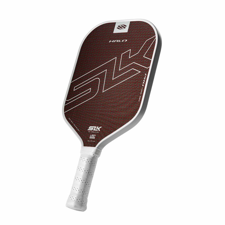 The SLK HALO Pro's resilient raw carbon Kevlar surface improves spin, and its large sweet spot and lighter weight enhance maneuverability, allowing for powerful drives, speed ups, and put-aways with control at the net, solidifying it as the pinnacle of craftsmanship and performance within the HALO series of paddles.