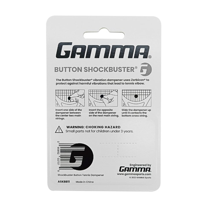 Utilizing patented Zorbicon® gel technology, the Shockbuster® Button Vibration Dampener effectively protects against harmful vibrations that lead to tennis elbow, ensuring a more enjoyable and injury-resistant playing experience. The unique button design strategically places the Zorbicon® gel, maximizing vibration reduction. Each pack includes two dampeners for added convenience.