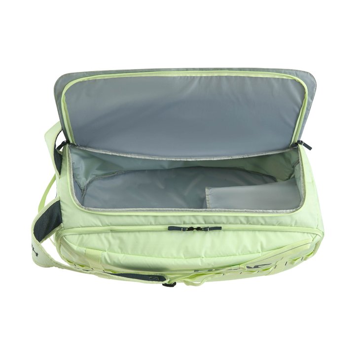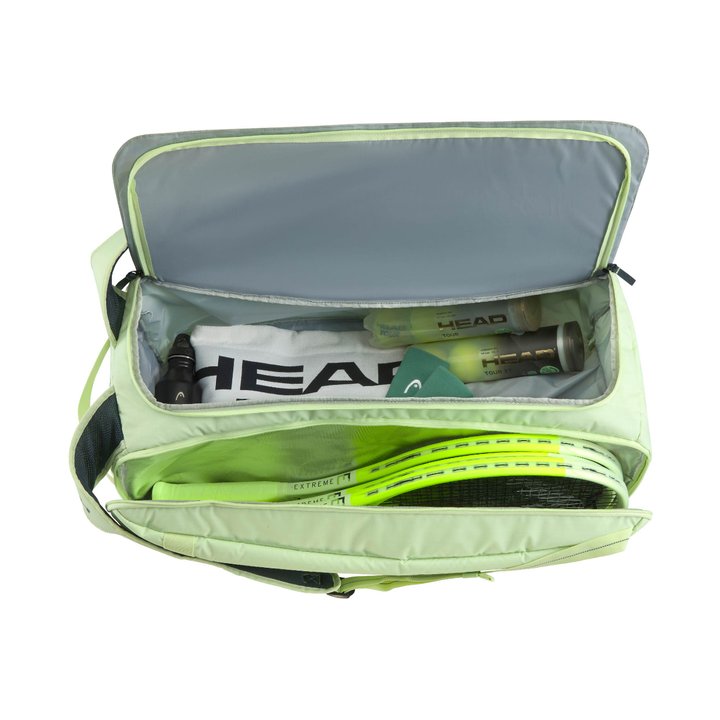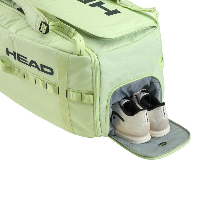 The PRO DUFFLE BAG L, which has been updated with a new, modern design that matches the EXTREME racquet series, is a stylish travel companion. Also upgraded with a new ripstop fabric that enhances durability, this bag gives you the space you need when you’re on the road. You can comfortably fit up to 9 racquets in the two spacious compartments. The additional inside mesh pocket and the outside pocket provide additional space for quick access, while the 2-way carry system lets you pick whether you want to flip the bag over your shoulder or onto your back for extra flexibility. The climate control technology CCT+ in one of the main compartments protects your racquets from higher temperatures. As an illustration of HEAD's commitment to sustainability, the bag comes with a hangtag crafted from recycled paper and secured with hemp cord.